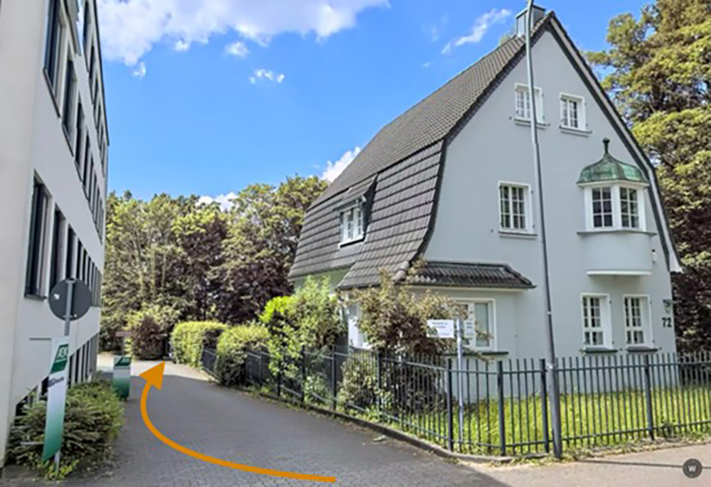 Sie finden Hinter dem Haus (s. Bild unten) eine begrenzte Anzahl an Privatparkplätzen, die Sie gerne nutzen können. Dafür müssen Sie zunächst den Weg am Zaun entlang fahren und dann rechts durch das offene Tor einfahren. Auf der Parkfläche sind die verfügbaren Stellplätze mit einem Schild „Praxis“ markiert. Alternativ können Sie auch vor der Praxis auf der Bensberger Straße für max. 2 Stunden mit Parkscheibe kostenfrei parken.